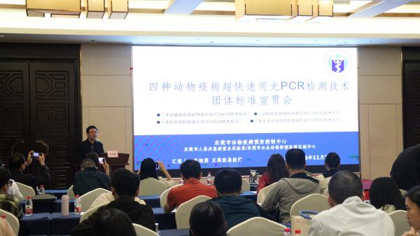 本次宣贯会特邀团体标准主要起草人、东莞市动物疫病预防控制中心正高级兽医师张险朋担任主讲。授课过程中,张险朋正高级兽医师围绕四项团体标准的核心内容展开系统解读:一是明确标准的研究背景与技术原理,阐释超快速荧光PCR技术在动物疫病检测中的优势;二是界定标准的核心术语定义与适用范围,厘清不同疫病检测场景下的应用边界;三是详解实际检测操作中的关键环节,包括耗材与仪器的准备要求、标准化操作流程、质量控制要点,以及检测结果的判定标准与异常情况处理方法,确保参训人员全面掌握技术规范要点。