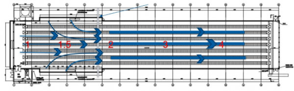 鸡舍多施行负压通风,每幢鸡舍后部需配备多组高效风机,推荐使用拢风筒风机,提高通风效率(图4)。两侧墙体安装通风小窗,规格约为30cm×60cm,在提高通风量的同时保证舍内气流稳定。根据不同日龄的通风需要,通过控制小窗角度调整侧面进风量。夏季采用湿帘进风降温时,建议采用湿帘分级控制,防止湿帘开启后湿帘端温度下降过快。应根据鸡舍笼具高度、顶棚高度等调整湿帘和侧墙小窗进风口导流板开启角度,保证入舍新风进入鸡舍顶部空间形成射流,使舍内外空气达到较好的混合效果,避免入舍新风直接吹向笼具,造成鸡群冷热应激。纵向通风控制方案见图5。